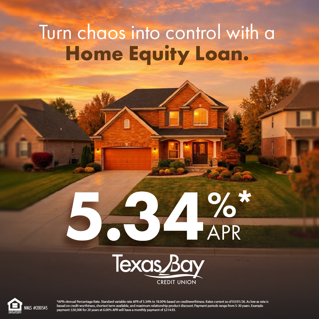 *To enter drawing, close on your new mortgage loan or refinance your mortgage loan, close on your home equity loan, close on your new auto loan or refinance your auto loan, or open a new Perks Checking or Premium Perks Checking account, with an opening balance of $500.00 or more, between 04/01/2026 and 05/31/2026 (promotional period). Requires approval. Mortgages, Home Equity Loans, Auto Loans, Perks Checking accounts, and Premium Perks Checking accounts opened prior to the promotional period are not eligible for this Drawing. All new mortgage, home equity, and auto loan types offered by TBCU are eligible except for internal refinances and indirect auto loans. Opening multiple Perks Checking accounts or Premium Perks Checking accounts will not result in additional entries. Members who already had an active Perks Checking or Premium Perks Checking account prior to the promotional period cannot gain entry by opening additional Perks Checking accounts or Premium Perks Checking accounts during the promotional period. Winner will be contacted in June 2026. Odds of winning depend on the number of entries received. Only members of Texas Bay Credit Union in good standing and other persons within the Credit Union’s field of membership 21 or older are eligible to participate in the drawing. Membership is required before utilizing any Credit Union product or service by establishing a savings account with $1. Officials and employees of the Credit Union and their family members are not eligible to participate in this Drawing. No purchase necessary to win. To submit an entry without purchase or obligation, a handwritten form must be on a 3”x5” index card to include your name, address, your Texas Bay Credit Union member account number (if applicable), telephone number, date of birth, and the last 4 digits of your social security number. Each entry must be mailed to Texas Bay Credit Union, Attn: Marketing/Astros VIP Promotion, 12611 Fuqua St, Houston, TX 77034. Must be postmarked by May 31st, 2026. Limit one manual entry per person. The Credit Union assumes no responsibility for late, incomplete, stolen, or illegible entries. The Credit Union may discontinue this offer at any time. Promotional period is April 1st, 2026 to May 31st, 2026.