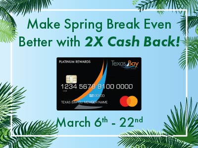 Due to significant fraud originating from foreign countries, Texas Bay Credit Union protects cardholders by limiting transactions outside of the U.S.A. If you plan to use your Texas Bay Platinum Rewards Credit Card while traveling or purchasing merchandise from a foreign country, please contact Texas Bay Credit Union in advance.